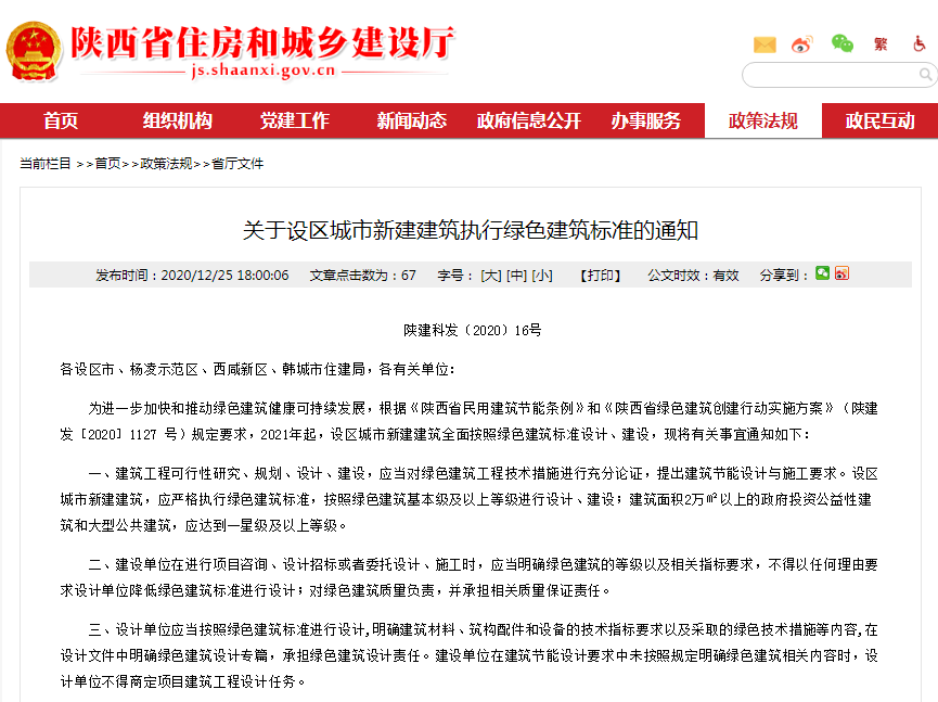 为进一步加快和推动绿色建筑健康可持续发展,根据《陕西省民用建筑节能条例》和《陕西省绿色建筑创建行动实施方案》(陕建发[2020]1127号)规定要求,2021年起,设区城市新建建筑全面按照绿色建筑标准设计、建设,现将有关事宜通知如下: